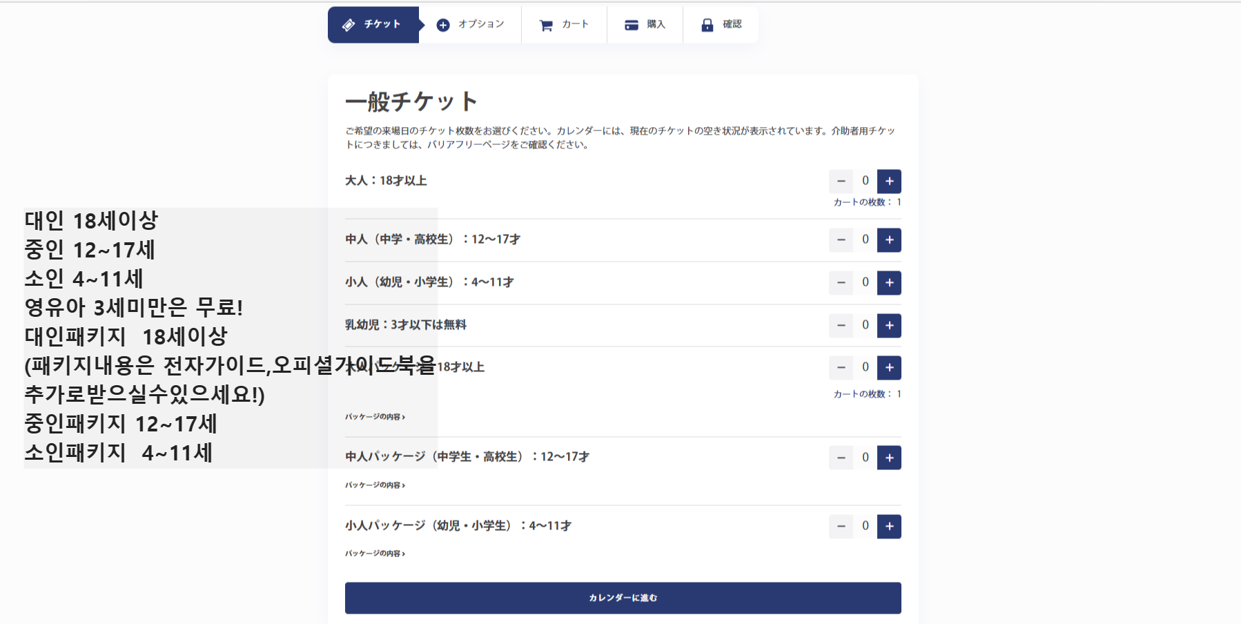 그러면 스크롤하셔서 내려가시면 왼쪽부터 대인, 중인, 소인으로 티켓을 선택할 수 있게 되어있어요!